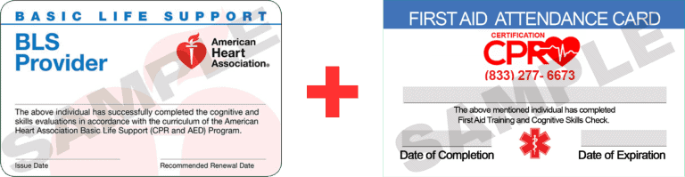 The BLS CPR and First Aid class includes the full AHA BLS course, including hands-on skills assessment, written exam, and a same-day CPR Card after successful completion.
